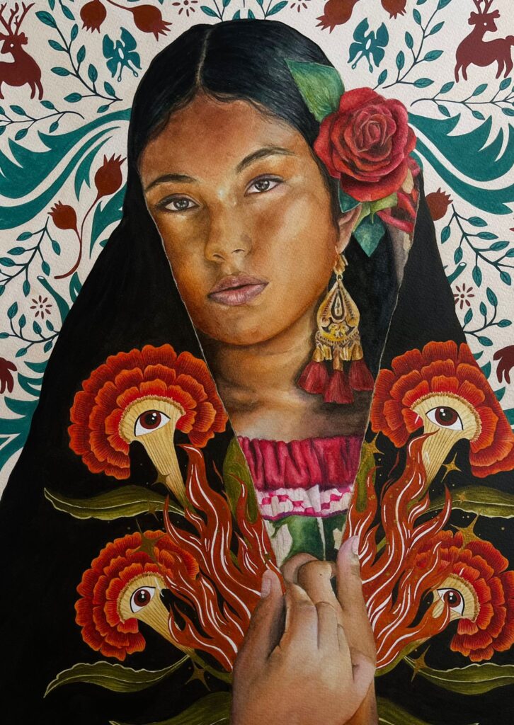 Cada obra es un pacto silencioso entre la emoción y la materia. Sus acuarelas lloran con ella, sus óleos suspiran, los grabados murmuran historias que nadie contaría. Hay en sus cuadros una densidad que deja huella: la memoria de la migración, el calor de la soledad, el rumor de una lágrima que se volvió pigmento. Son mapas para quien se atreva a navegar entre símbolos, emociones y secretos, sin guía ni brújula.